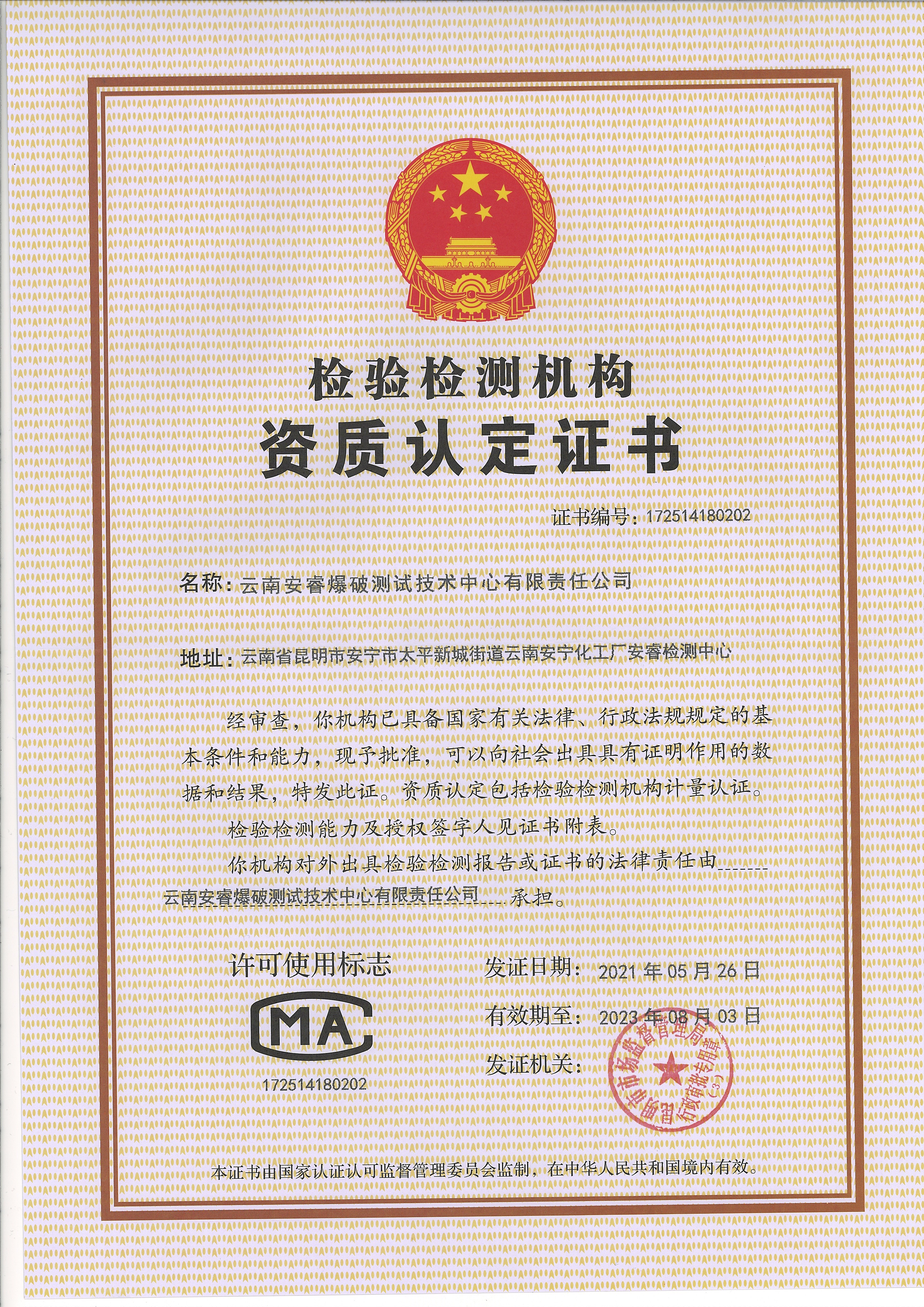 云南安睿爆破測試技術(shù)中心有限責(zé)任公司順利完成了檢驗(yàn)檢測機(jī)構(gòu)資質(zhì)認(rèn)定場地變更評(píng)審工作后,于2021年5月28日取得檢驗(yàn)檢測機(jī)構(gòu)資質(zhì)認(rèn)定證書。