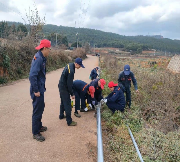 因事關(guān)村民生活保障,分公司領(lǐng)導(dǎo)幾次組織人員親臨現(xiàn)場,與村民負責(zé)人進行溝通協(xié)商,不斷改進施工方案。由于擔(dān)心管道改造影響生產(chǎn)生活供水,改造方案確定后,施工必須在兩天內(nèi)完成。時間緊、任務(wù)重,在做好準備工作后,玉溪分公司現(xiàn)場施工人員利用停產(chǎn)間隙,于1月25日清晨,迎著刺骨的寒風(fēng)開始作業(yè)。在現(xiàn)場負責(zé)人的指揮下,開挖過路預(yù)埋溝渠、排布、固定、組焊、回填等流程皆按預(yù)定程序有序推進。