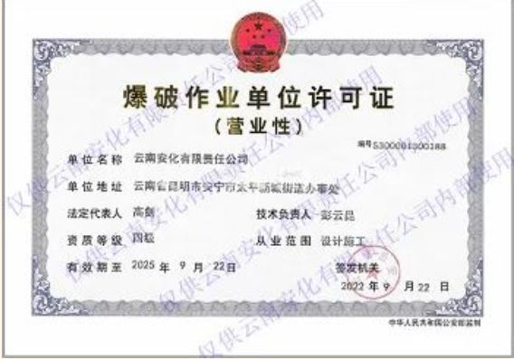 路雖遠,行則至;事雖難,做則成!金秋十月,經(jīng)過多方協(xié)調(diào),云南安化有限責(zé)任公司取得營業(yè)性爆破作業(yè)單位許可,與之前取得的生產(chǎn)許可證、危險貨物運輸?shù)缆方?jīng)營許可證成為公司啟動現(xiàn)場混裝作業(yè)資質(zhì)的必備三證,為實現(xiàn)公司爆破服務(wù)一體化進程提供了資質(zhì)保證。