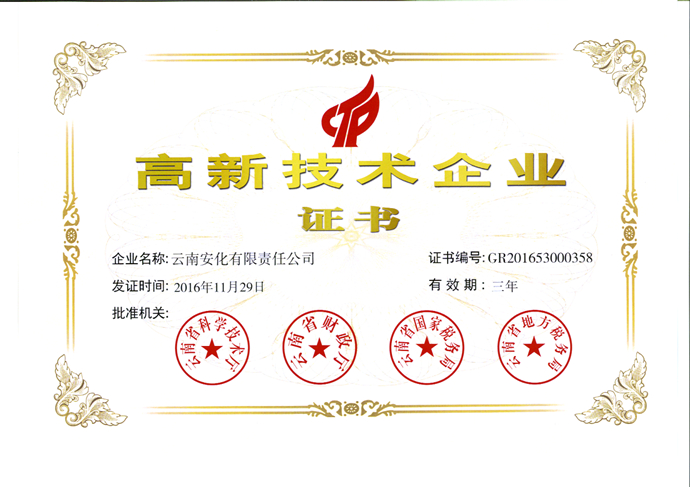 2016年11月29日,根據(jù)《高新技術(shù)企業(yè)認(rèn)定管理辦法》(國科發(fā)火〔2016〕32號(hào))和《高新技術(shù)企業(yè)認(rèn)定管理工作指引》(國科發(fā)火〔2016〕195號(hào))的規(guī)定,經(jīng)州(市)科技、財(cái)政、國稅、地稅部門審查推薦,云南省環(huán)保、質(zhì)監(jiān)、安監(jiān)等部門確認(rèn),認(rèn)定云南安化有限責(zé)任公司前一年內(nèi)未發(fā)生重大安全、重大質(zhì)量事故或嚴(yán)重環(huán)境違法行為,經(jīng)云南省高新技術(shù)企業(yè)認(rèn)定管理工作領(lǐng)導(dǎo)小組辦公室進(jìn)行形式審查、組織專家評(píng)審、聯(lián)合審定等程序,認(rèn)定云南安化有限責(zé)任公司為國家高新技術(shù)企業(yè),有效期三年。